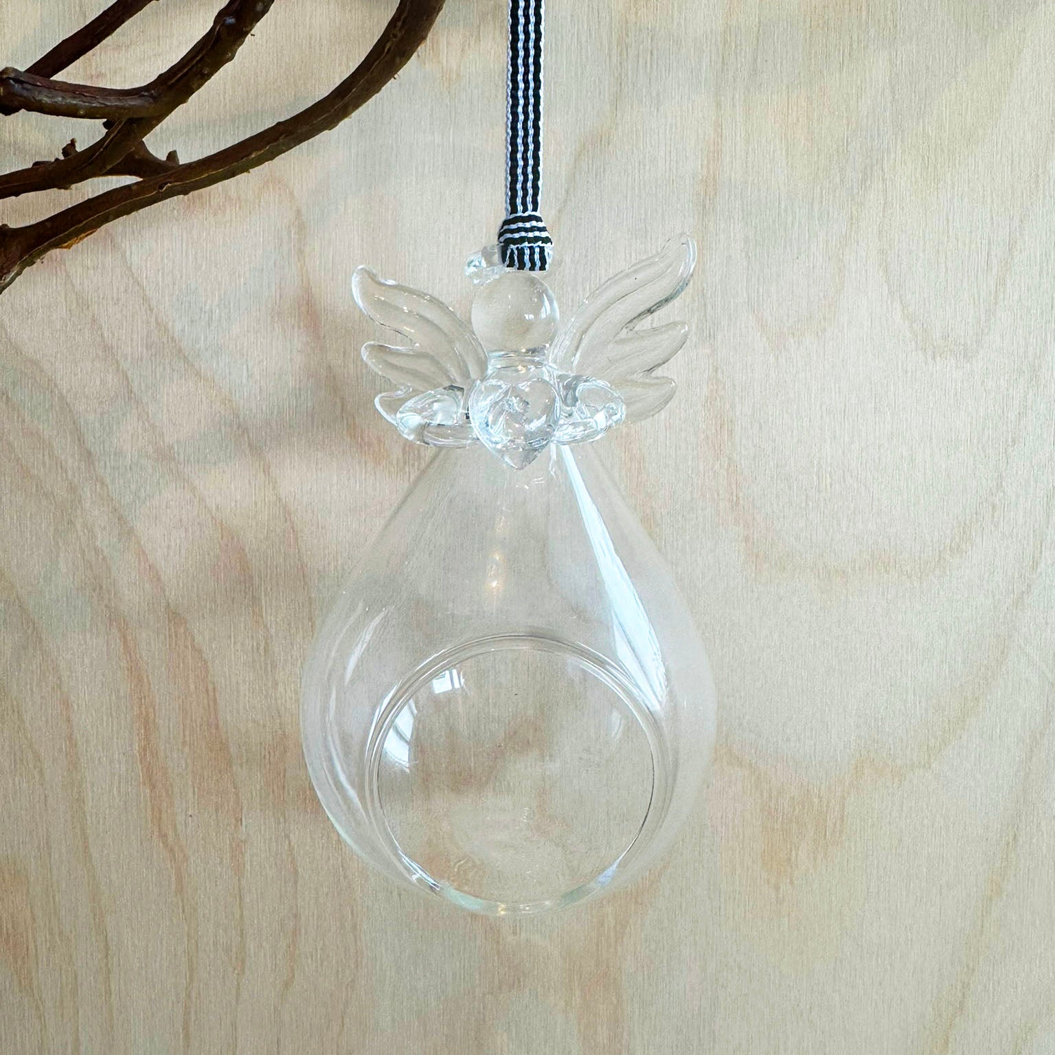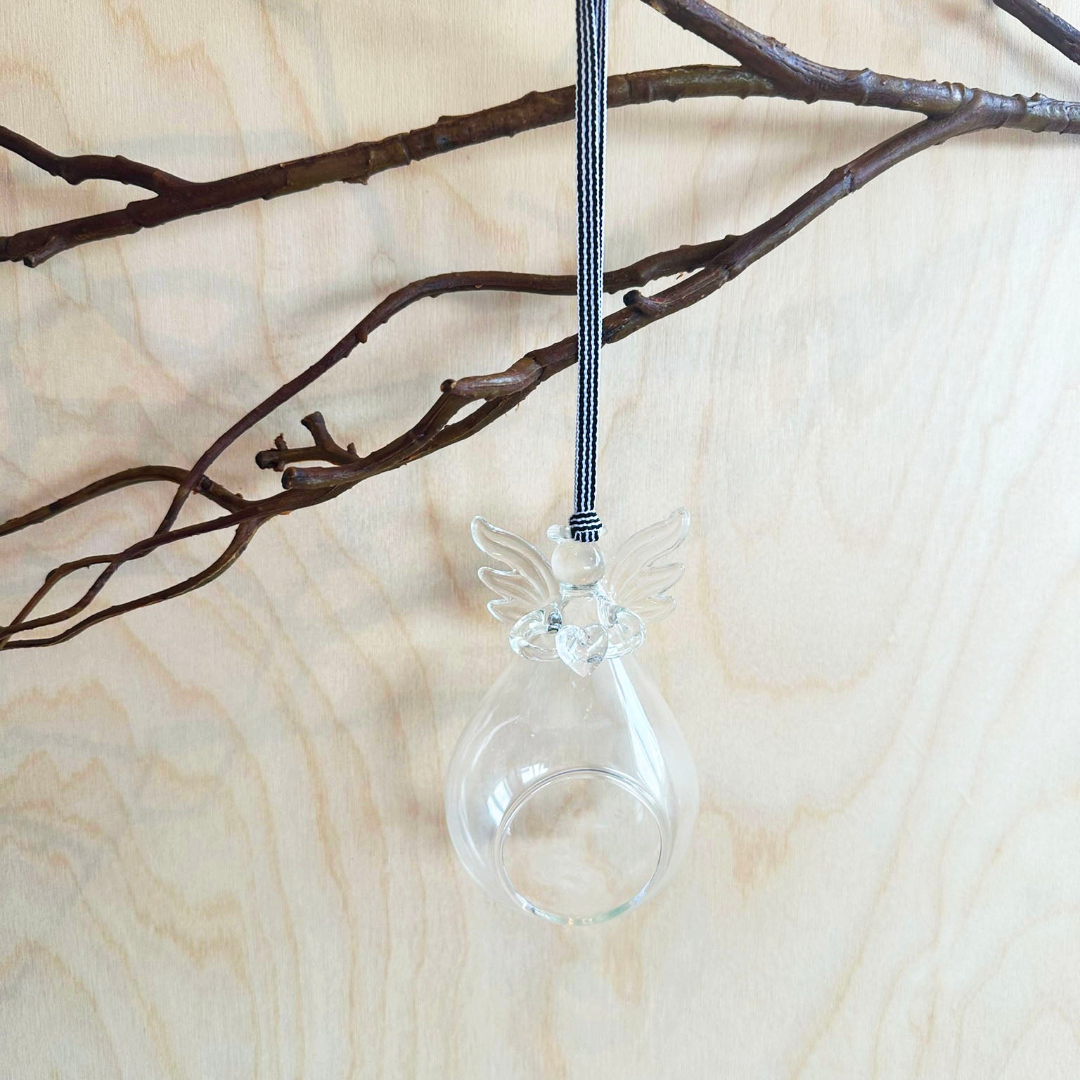This pretty glass angel makes an eye-catching Christmas tree decoration, table decoration or sympathy gift. The angel has an opening at the front so you can display an item inside, such as a photograph, message, treat or tealight (battery tealight only). It can be sent with a handwritten gift message.